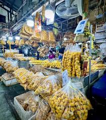 - 黄色いフルーツ: マンゴーやドリアンなど、南国ならではの鮮やかな黄色い果物が店先に山積みにされています。